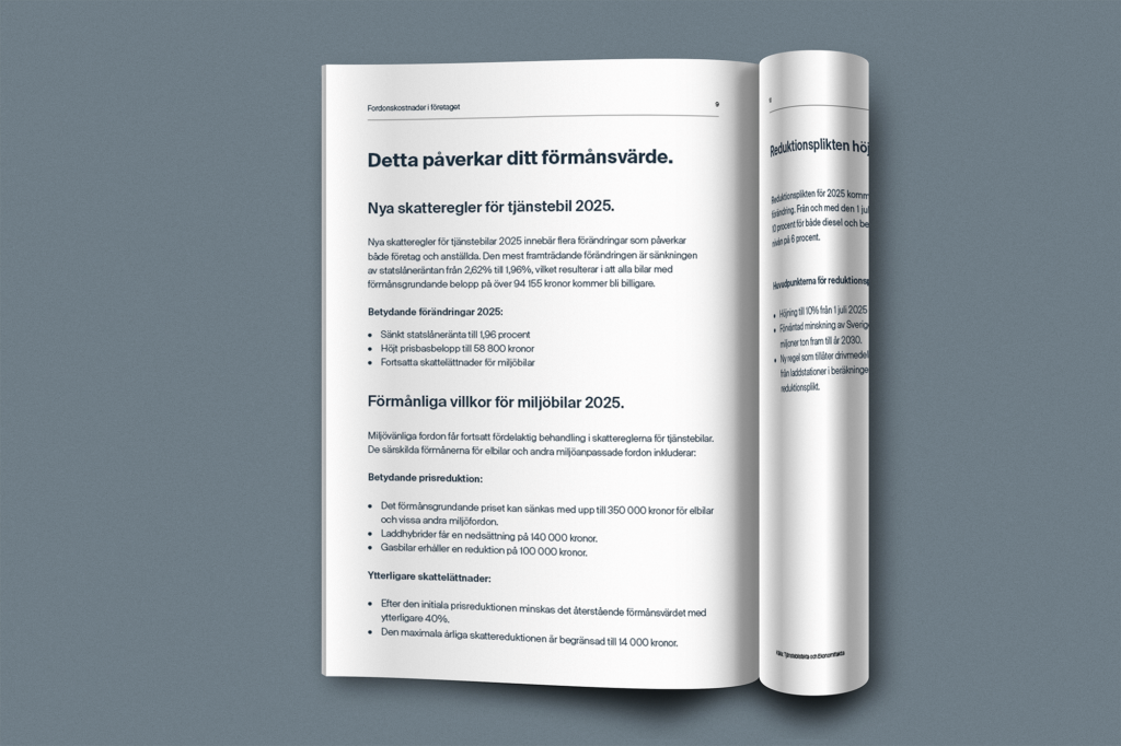 Från sänkt statslåneränta till fortsatta skattelättnader för el- och miljöbilar – 2025 bjuder på flera förändringar som gör det billigare att ha tjänstebil. Dessutom skärps reduktionsplikten, vilket påverkar drivmedelskostnaderna och klimatavtrycket.