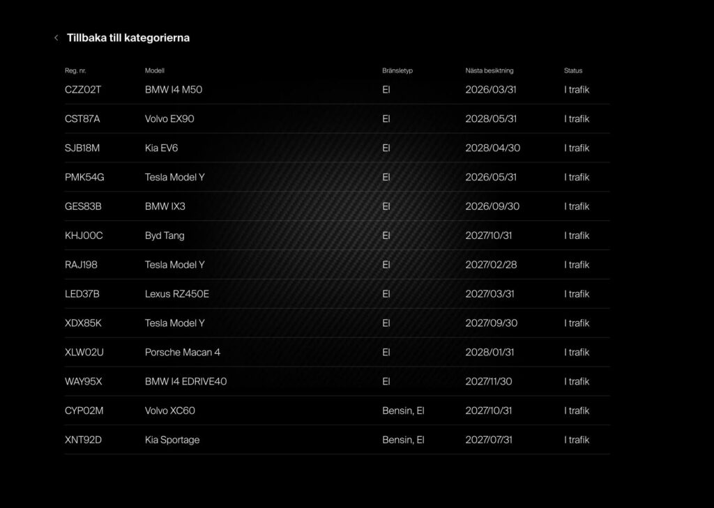 Du får direkt koll på hur många förmåns– och företagsbilar ni har, vilket drivmedel de kör på, aktuell status och när nästa besiktning väntar.