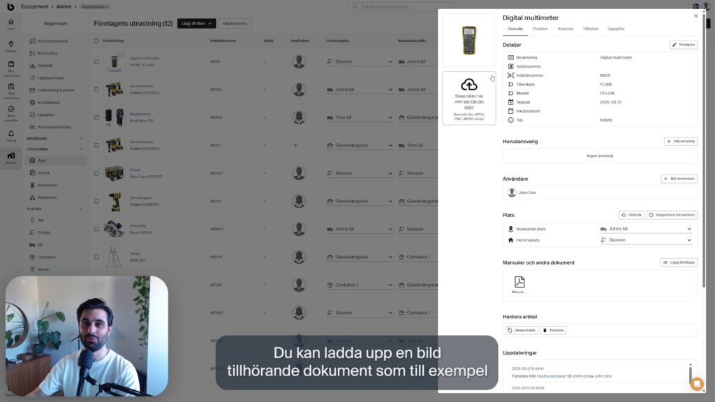 Spåra allt – från små handverktyg till stora maskiner. Fäst skannbara etiketter, Bluetooth- eller GPS-trackers på din utrustning så att du snabbt hittar det du behöver och ser vem som använder vad just nu.