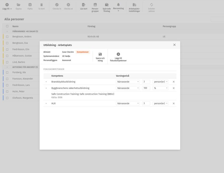 Kompetenser består av flera smarta verktyg för att öka säkerheten på arbetsplatsen. Vi underlättar för platsledningen att säkerställa att endast personal med rätt kompetens får utföra kritiska moment på arbetsplatsen och följa upp att verksamma personer som vistas på arbetsplatsen har utbildning inom vald fokuskompetenser.