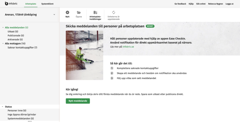Alla som befinner sig på arbetsplatsen kan ladda ned appen Ease CheckIn, där de enkelt kan registrera sin närvaro och låsa upp dörrar och grindar och mycket mer. Platsledningen kan enkelt kommunicera med alla genom meddelandefunktionen i appen. All hantering görs i Infobric Site.