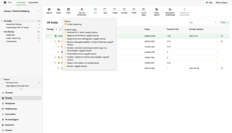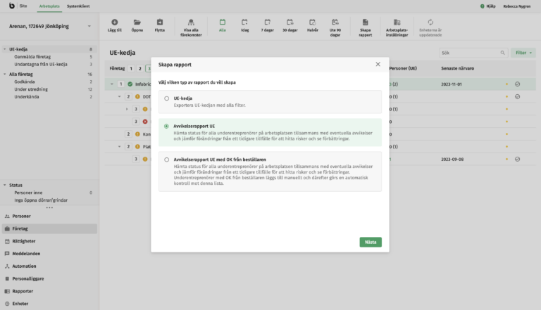 Rapporten bygger på arbetsplatsens UE-kedja och närvaroregistreringar, som kombineras med upplysningar från olika datakällor. Resultatet jämförs med de krav som ställs genom Bankinitiativet. I avvikelserapporten har du möjlighet att se nuläge och förändringar under vald period och få en tydlig överblick över framsteg i ert seriositetsarbete. Du har även möjlighet att enkelt exportera ut rapporten till intressenter. Syftet med rapporten är att erbjuda ett verktyg som inte bara används för att kartlägga nuet, men också för att driva förändring i positiv riktning.