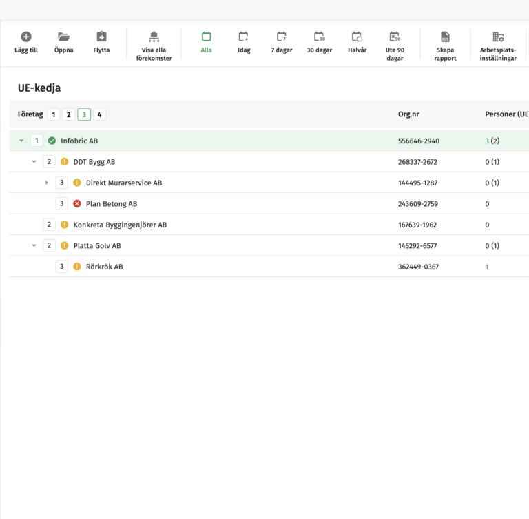 Kontroll och transparens är viktiga pusselbitar för att stärka byggbranschens anseende och skapa förutsättningar för sund konkurrens. UE-kedja är en funktion i Infobric Site som ger dig överblick över vilka underentreprenörer som är verksamma på arbetsplatsen.