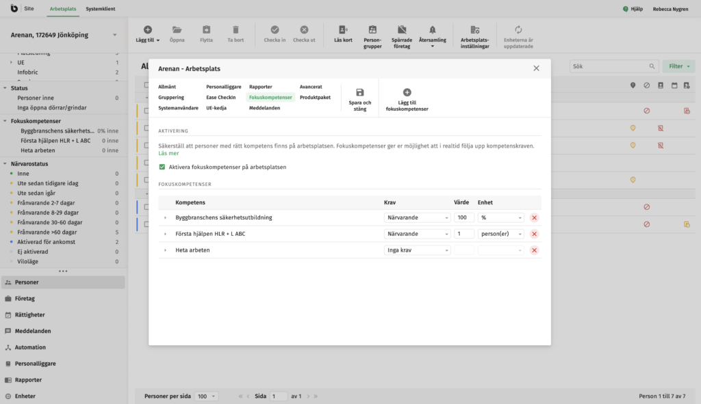 Manage competency requirements at the workplace by setting up which focus competencies should be present and how many individuals or what percentage of active personnel should have each competency. In the personnel overview at the workplace in Infobric Site, you always have control over meeting the required levels.