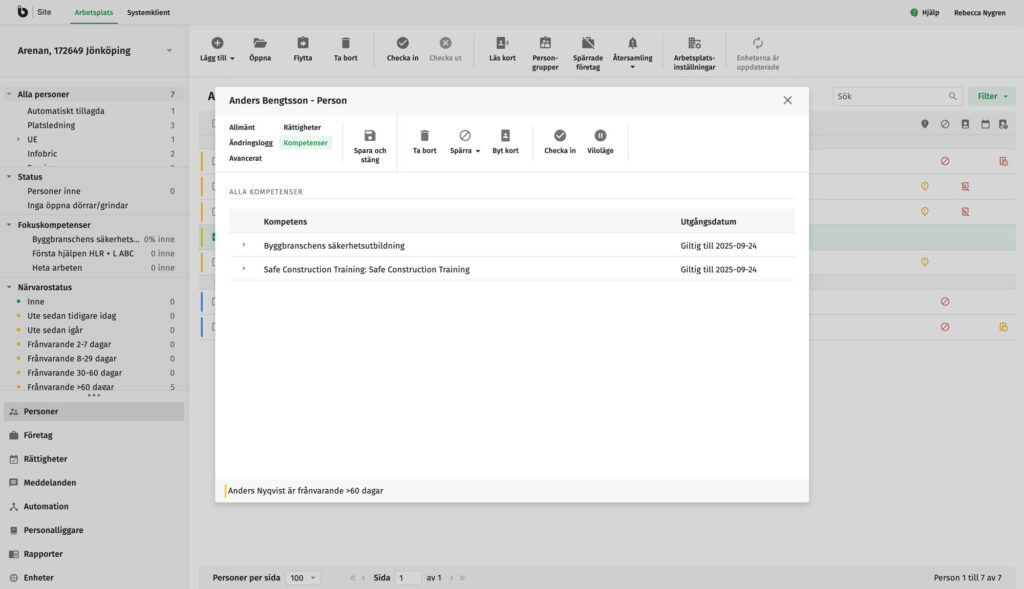 You get access to each individual’s competency certificates from the ID06 Competence Database directly in the service for your workplace. It is easy to verify that only personnel with the right competence are allowed to perform critical tasks on the workplace and to follow up that active personnel on the site have training in selected focus competencies.