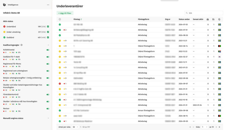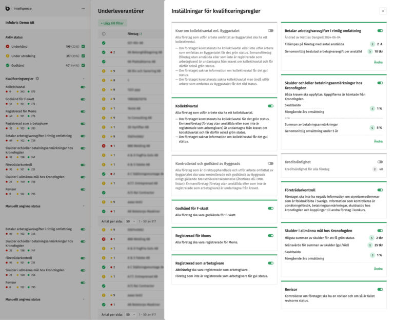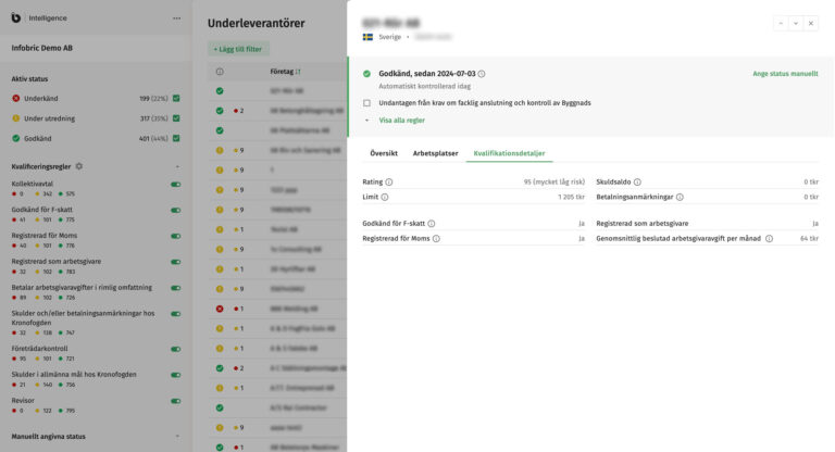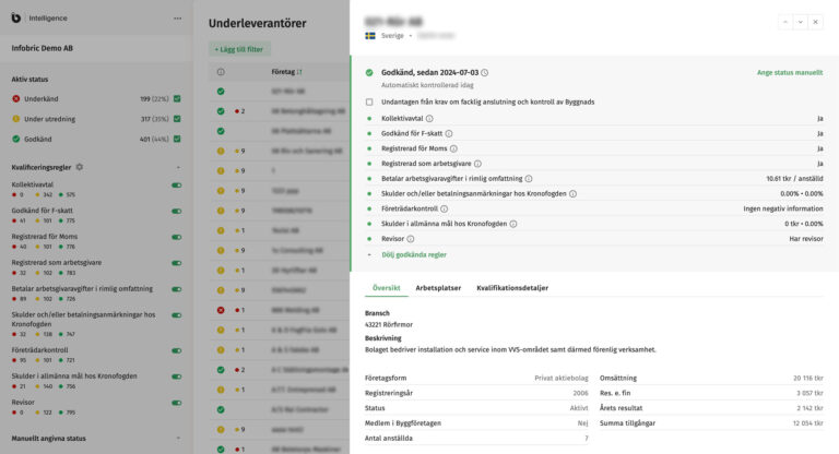 An important part of this is the ability to monitor subcontractors at all levels to ensure that suppliers meet the requirements and guidelines established by the initiative. The conditions include requirements for control systems and project reports, mandatory pre-registration, ensuring that all subcontractors pay Swedish F-tax and employer contributions, and have no outstanding debts with the Swedish Enforcement Authority. With Infobric Intelligence, offered in our Plus package, you ensure that you have everything needed to meet the requirements of the Bank Initiative.