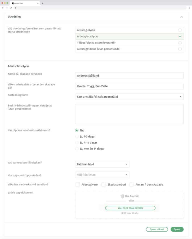 Click Report in the menu in our mobile app, or do it under Incidents in the project view on the web. All users have the right to report observations and incidents. When a person in charge has handled the report, an email will automatically be sent out to the reporter.