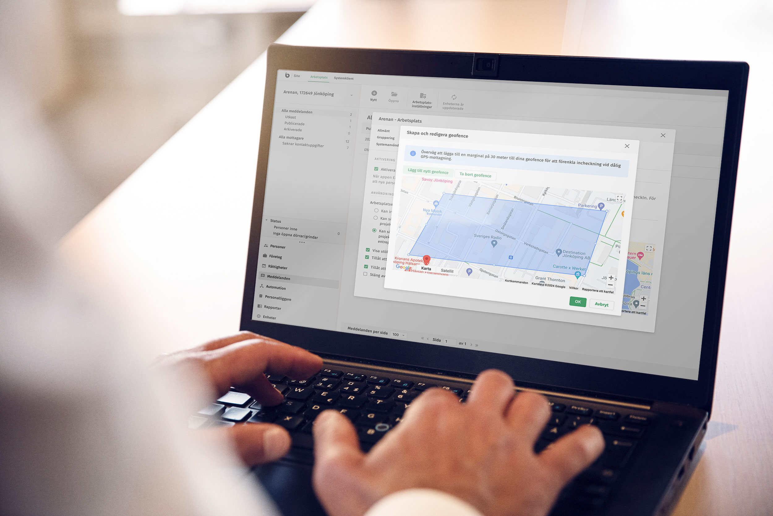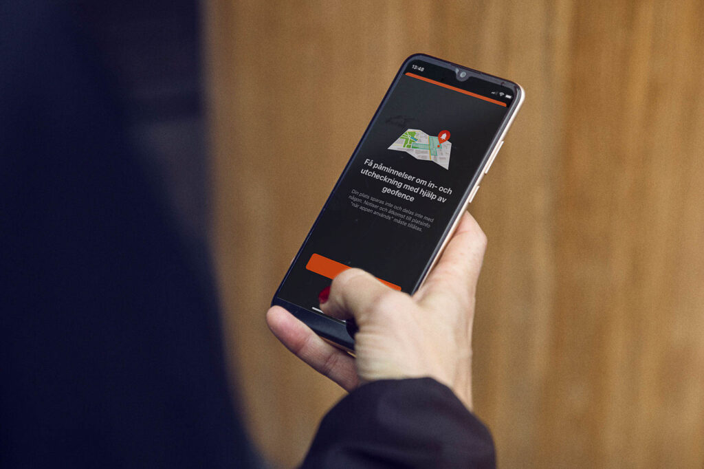 Geofence är ett digitalt verktyg som säkerställer att incheckningar sker på rätt plats. Användaren kan endast checka in när hen befinner sig på den angivna arbetsplatsen, och platsbaserade notiser påminner när det är dags att checka in vid ankomst och ut vid avfärd