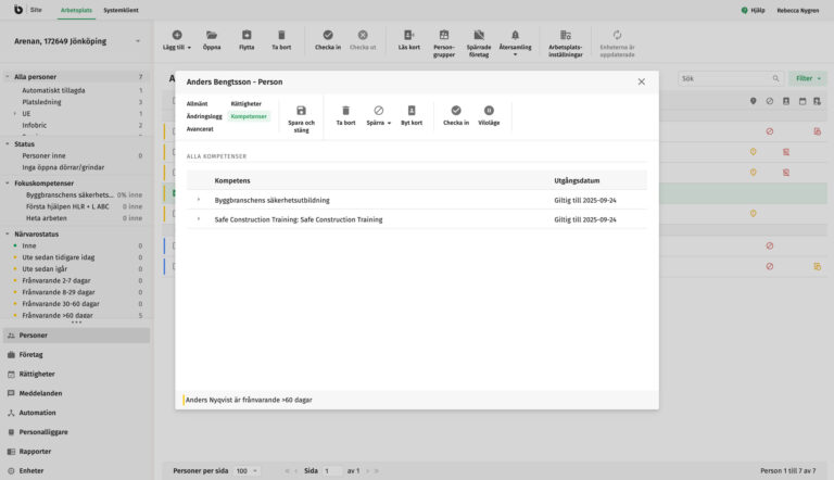 Du får tillgång till varje individs kompetensbevis från ID06 Kompetensdatabas direkt i tjänsten för din arbetsplats. Det är enkelt kontrollera att endast personal med rätt kompetens får utföra kritiska moment på arbetsplatsen och följa upp att verksamma personer som vistas på arbetsplatsen har utbildning inom valda fokuskompetenser.