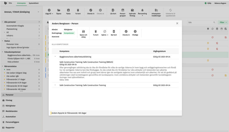 Du får tillgång till varje individs kompetensbevis från ID06 Kompetensdatabas direkt i tjänsten för din arbetsplats. Det är enkelt kontrollera att endast personal med rätt kompetens får utföra kritiska moment på arbetsplatsen och följa upp att verksamma personer som vistas på arbetsplatsen har utbildning inom valda fokuskompetenser.