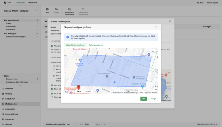- Ett eller flera geofenceområden definieras av platsadministratör i Infobric Site. Platsadministratören ritar där ut virtuella staket och kan enkelt både lägga till och ta bort områden efter behov. En spridd arbetsplats kan alltså ha flera geofenceområden.