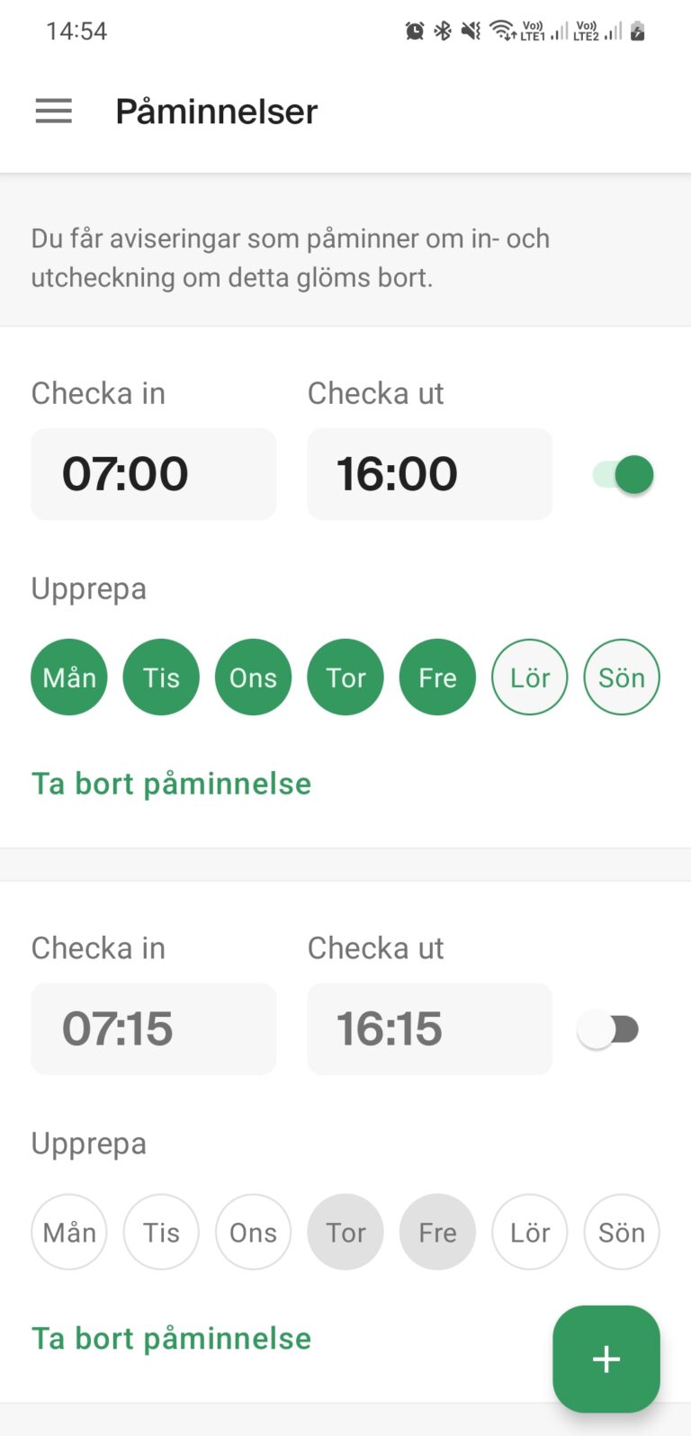 Checkar du in eller ut olika tider under veckodagarna? Inga problem! Du kan enkelt lägga till och ta bort påminnelser, ändra tider och välja vilka veckodagar som påminnelsen ska gälla. Du kan också enkelt tillfälligt stänga av eller sätta på påminnelsen.