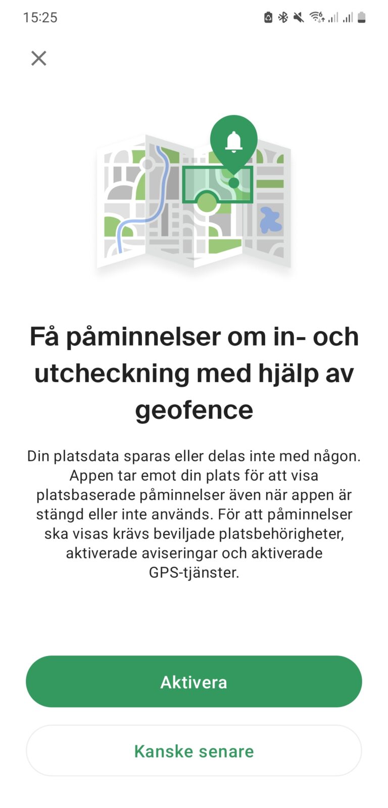 Har användaren glömt att checka in när den kommer till sin arbetsplats plingar det till i mobilen och en notis uppmanar till incheckning. Det går även att checka in direkt från denna notis genom att hålla inne fingret på notisen. Lika smidigt fungerar det med utcheckning.