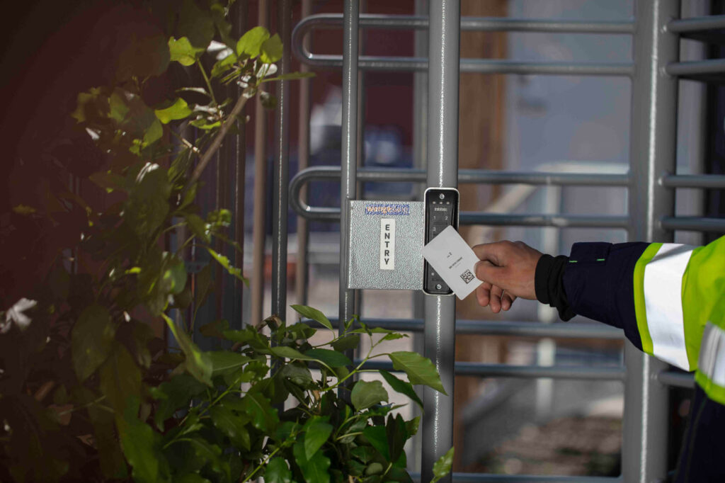Med Infobrics persongrindar och webbtjänsten Infobric Site ökar säkerheten på byggarbetsplatsen. I webbtjänsten går det smidigt att styra rättigheter och scheman. Grinden öppnas enkelt för behöriga med ett ID06-kort mot kortläsaren eller med app.